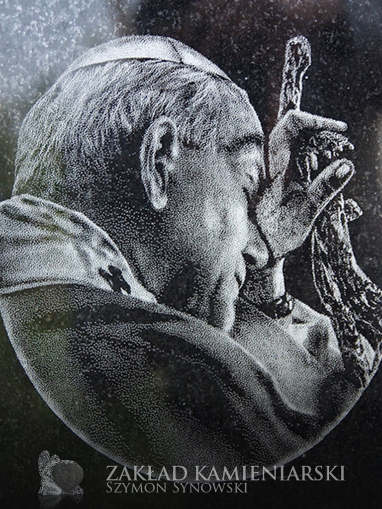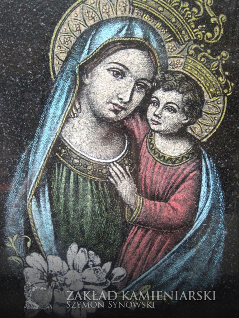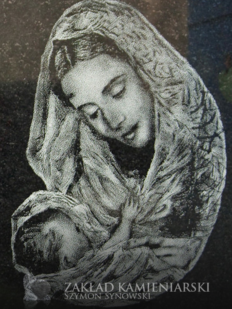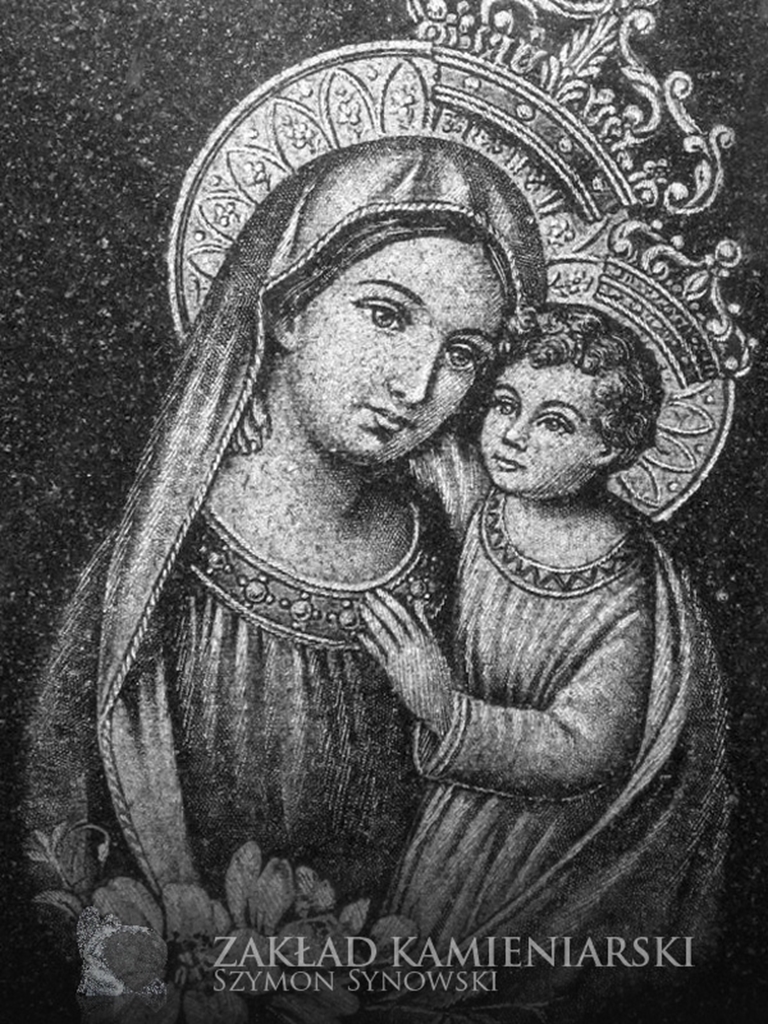 To inaczej wizerunki grawerowane w kamieniu nagrobkowym, które – podobnie jak fotografie porcelanowe – nadają nagrobkom bardziej osobisty charakter. Nasi klienci mogą zlecić wygrawerowanie wizerunku osoby zmarłej, ale też świętego lub innej osoby. Dysponujemy zestawem wzorów wizerunków Jezusa, Marii, św. Jana Pawła II itd. do wyboru.